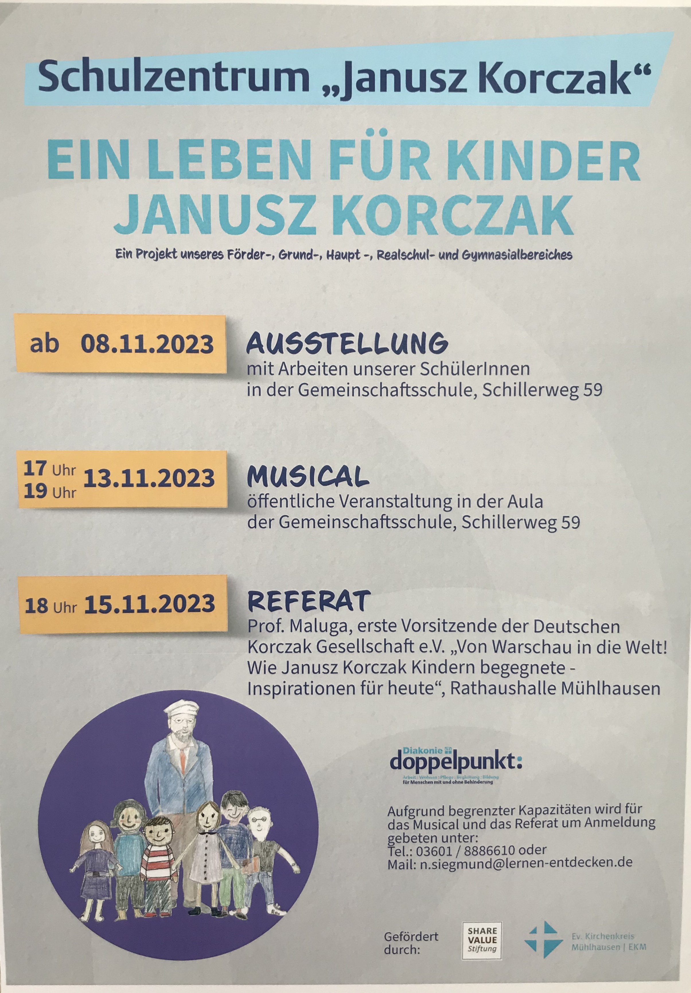 Die Schülerinnen und Schüler sowie die Pädagoginnen und Pädagogen des Schulzentrums "Janusz Korczak" in Mühlhausen haben sich viel vorgenommen! 7 Tage mit Janusz Korczak: Gedenken, Begehen, Feiern, Begegnen. "Das kommende Schuljahr 2023-2024 ist ein besonders Schuljahr für uns. In diesem Jahr soll unser Namensgeber im Mittelpunkt unserer vielfältig geplanten Aktivitäten stehen. Denn wir sind stolz, diesen besonderen Namen zu tragen."