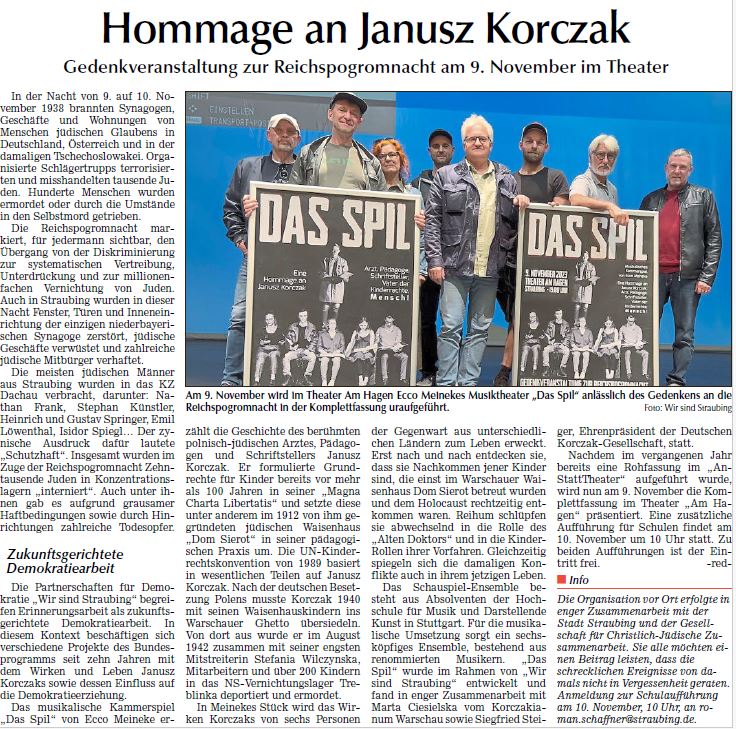 Am 9. November 2023 findet Im Theater am Hagen eine Gedenkveranstaltung zur Reichspogromnacht statt. Das musikalische Kammerspiel „Das Spil“ von Ecco Meineke erzählt die Geschichte des berühmten polnisch-jüdischen Arztes, Pädagogen und Schriftstellers Janusz Korczak. Das Straubinger Team von "Wir sind bunt" und "Wir sind Straubing" möchten ein Zeichen setzen gegen Antisemitismus: