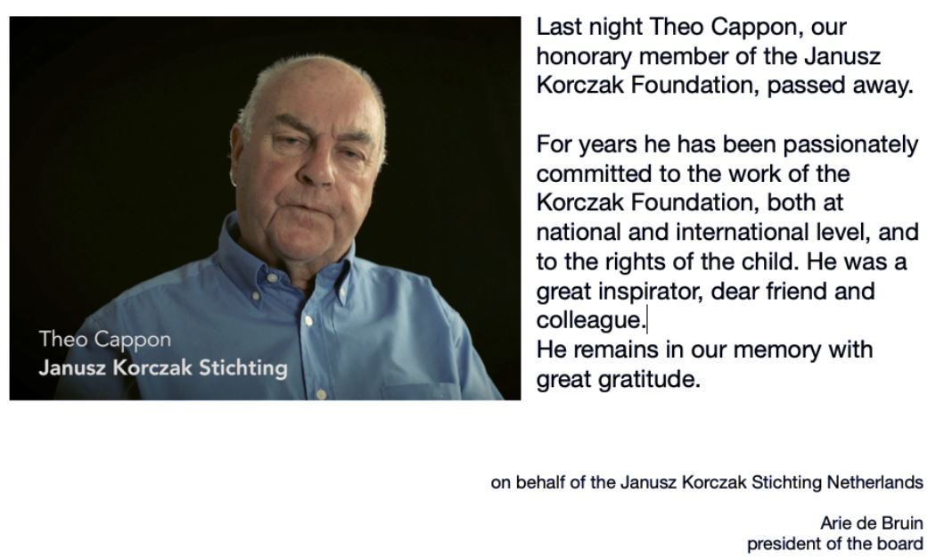 wir trauern mit unseren Freunden von der Niederländischen Korczak-Gesellschaft um Theo Cappon, einen wunderbaren Freund und großen Korczakianer, der mit Herzblut und Humor, Wissen und Engagement Janusz Korczak und sein Lebenswerk unermüdlich in die Welt trug.